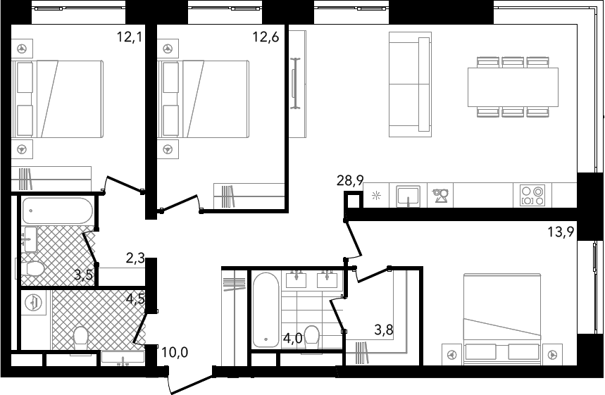 4-комнатная квартира № 1, 95.59 м2 без отделки 3 эт.