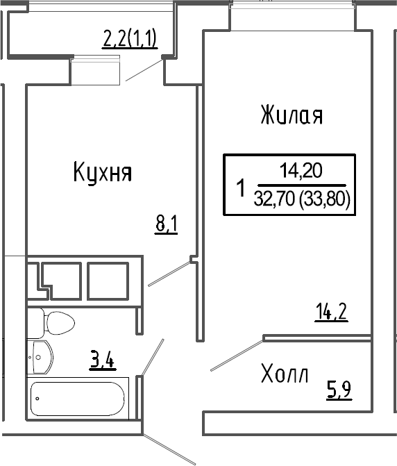 1-комнатная квартира № 4, 31.60 м2 без отделки 1 эт.