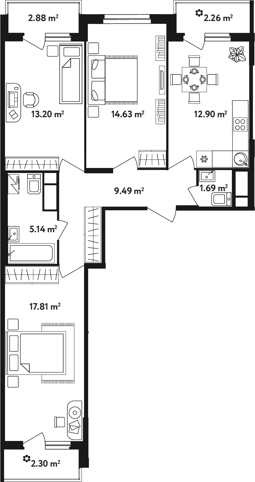 3-комнатная квартира № 162, 74.86 м2 с отделкой 4 эт.