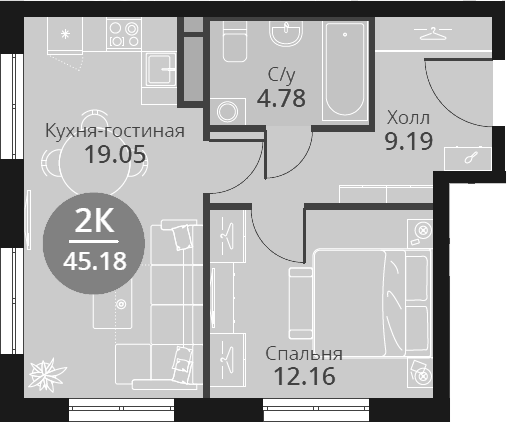2-комнатная квартира № 2-7-6, 45.18 м2 без отделки 7 эт.
