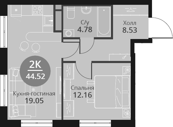 2-комнатная квартира № 2-15-6, 44.52 м2 без отделки 15 эт.