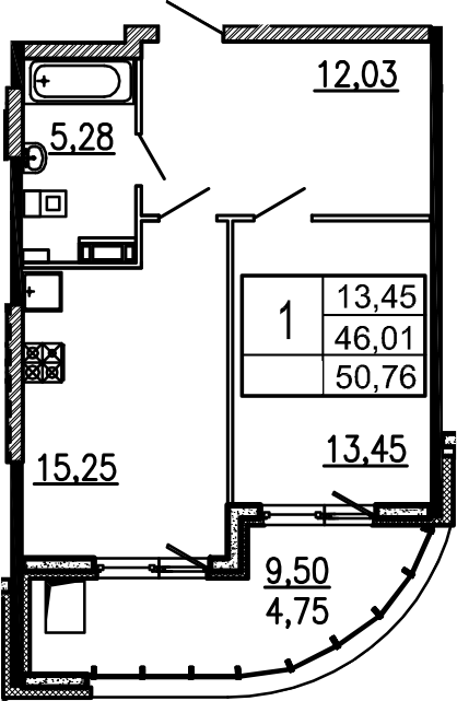 1-комнатная квартира № 230, 46.01 м2 без отделки 7 эт.