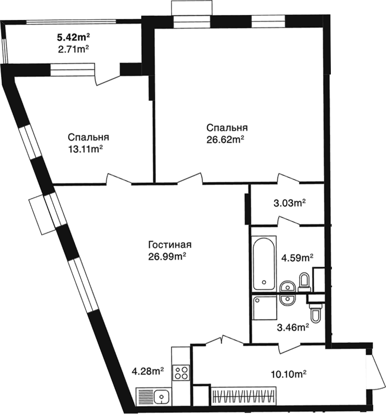 3-комнатная квартира № 1, 92.18 м2 без отделки 1 эт.