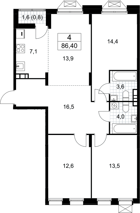 4-комнатная квартира № 559, 85.60 м2 без отделки 4 эт.