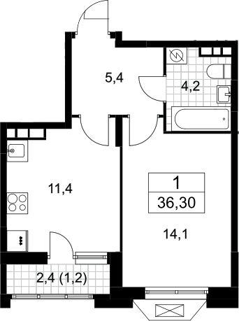 1-комнатная квартира № 458, 35.10 м2 без отделки 6 эт.