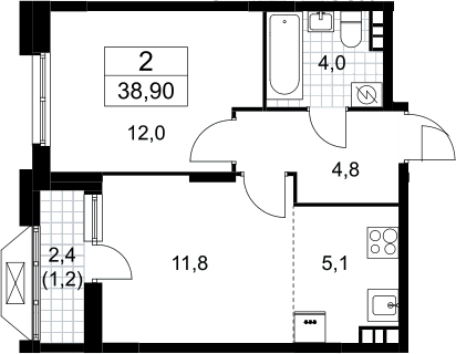 2-комнатная квартира № 672, 37.70 м2 без отделки 8 эт.
