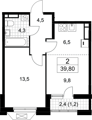 2-комнатная квартира № 390, 38.60 м2 с отделкой 10 эт.
