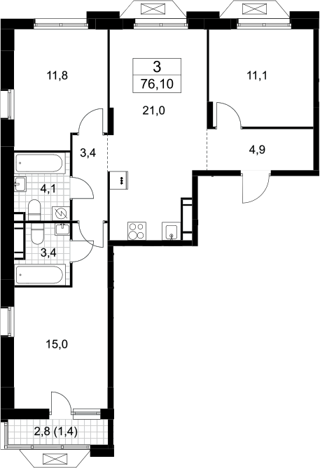 3-комнатная квартира № 234, 74.70 м2 с отделкой 13 эт.