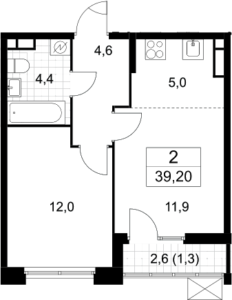 2-комнатная квартира № 307, 37.90 м2 без отделки 7 эт.