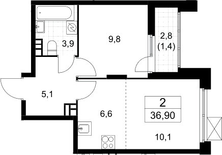 2-комнатная квартира № 161, 35.50 м2 без отделки 4 эт.
