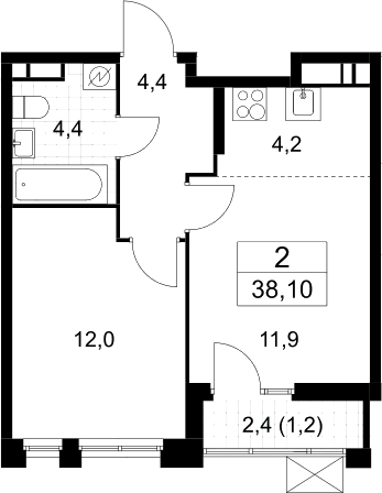 2-комнатная квартира № 378, 36.90 м2 без отделки 11 эт.