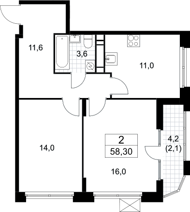 2-комнатная квартира № 103, 56.20 м2 с отделкой 13 эт.