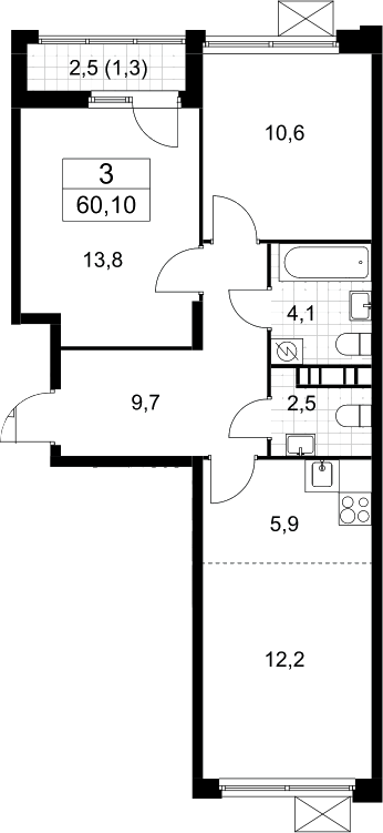 3-комнатная квартира № 542, 58.80 м2 с отделкой 4 эт.