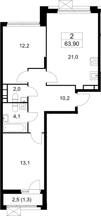 2-комнатная квартира № 415, 62.60 м2 без отделки 8 эт.
