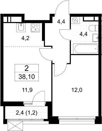 2-комнатная квартира № 438, 36.90 м2 без отделки 13 эт.