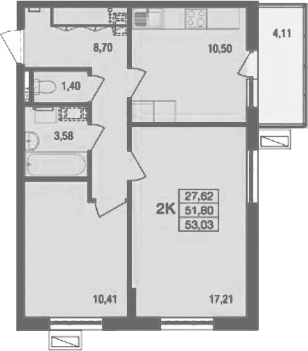 2-комнатная квартира № 2, 51.80 м2 без отделки 2 эт.