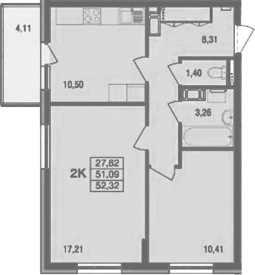 2-комнатная квартира № 155, 51.09 м2 без отделки 13 эт.
