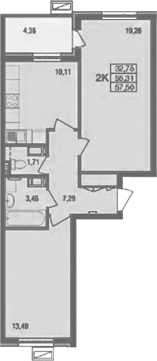 2-комнатная квартира № 292, 55.31 м2 без отделки 13 эт.