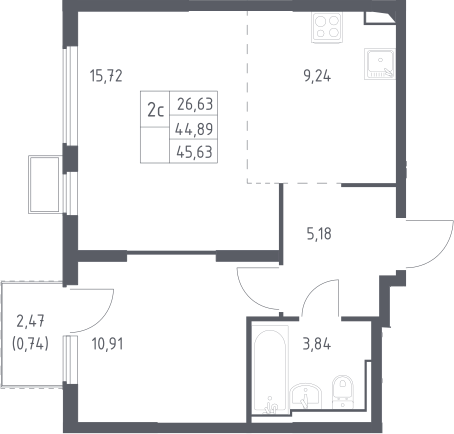 2-комнатная квартира № 383, 44.89 м2 с отделкой 8 эт.