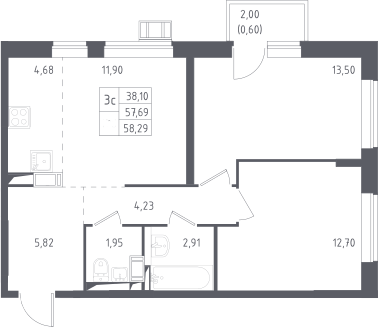 3-комнатная квартира № 49, 57.69 м2 с отделкой 6 эт.