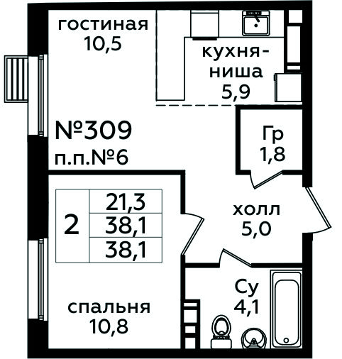 2-комнатная квартира № 309, 38.10 м2 с отделкой 12 эт.