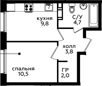 1-комнатная квартира № 21, 30.80 м2 без отделки 4 эт.