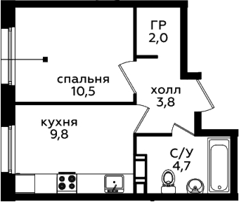 1-комнатная квартира № 76, 30.80 м2 без отделки 4 эт.