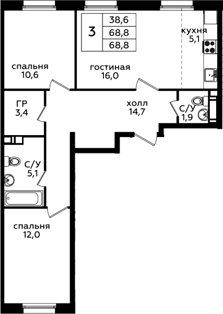 3-комнатная квартира № 221, 68.80 м2 с отделкой 4 эт.