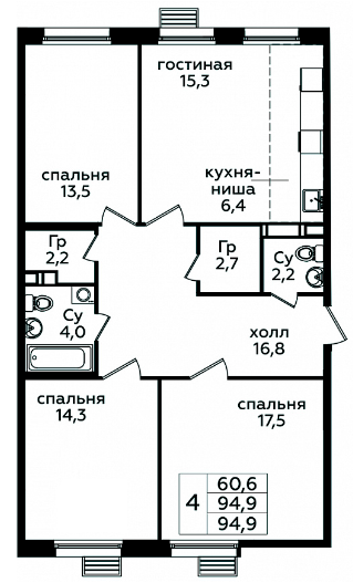 4-комнатная квартира № 786, 94.90 м2 с отделкой 5 эт.