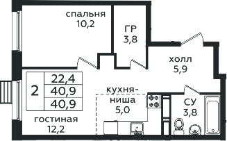 2-комнатная квартира № 415, 40.90 м2 с отделкой 9 эт.
