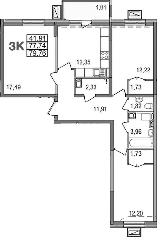 3-комнатная квартира № 133, 77.74 м2 без отделки 9 эт.