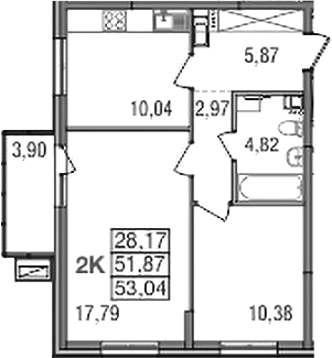 2-комнатная квартира № 152, 51.87 м2 без отделки 15 эт.