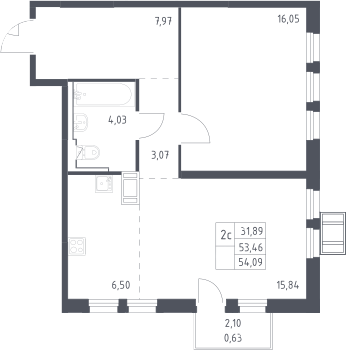 2-комнатная квартира № 29, 53.46 м2 с отделкой 4 эт.