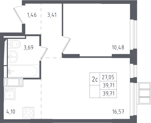 2-комнатная квартира № 179, 39.71 м2 с отделкой 7 эт.