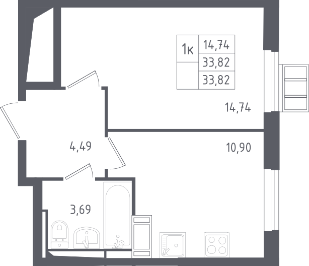 1-комнатная квартира № 221, 33.82 м2 с отделкой 11 эт.