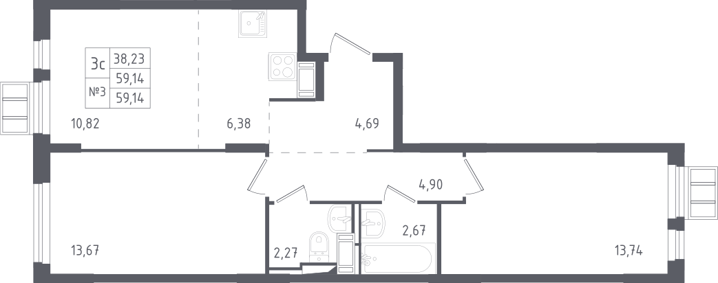 3-комнатная квартира № 426, 59.14 м2 с отделкой 16 эт.