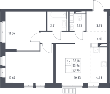 3-комнатная квартира № 489, 53.96 м2 с отделкой 14 эт.