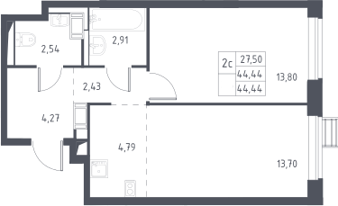 2-комнатная квартира № 138, 44.44 м2 с отделкой 14 эт.