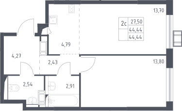 2-комнатная квартира № 50, 44.44 м2 с отделкой 6 эт.