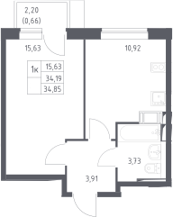 1-комнатная квартира № 229, 34.19 м2 с отделкой 10 эт.