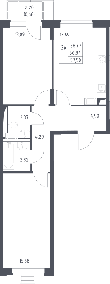 2-комнатная квартира № 35, 56.84 м2 с отделкой 8 эт.