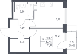 1-комнатная квартира № 264, 32.45 м2 с отделкой 8 эт.