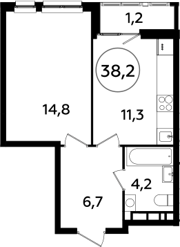 1-комнатная квартира № 845, 39.40 м2 без отделки 17 эт.