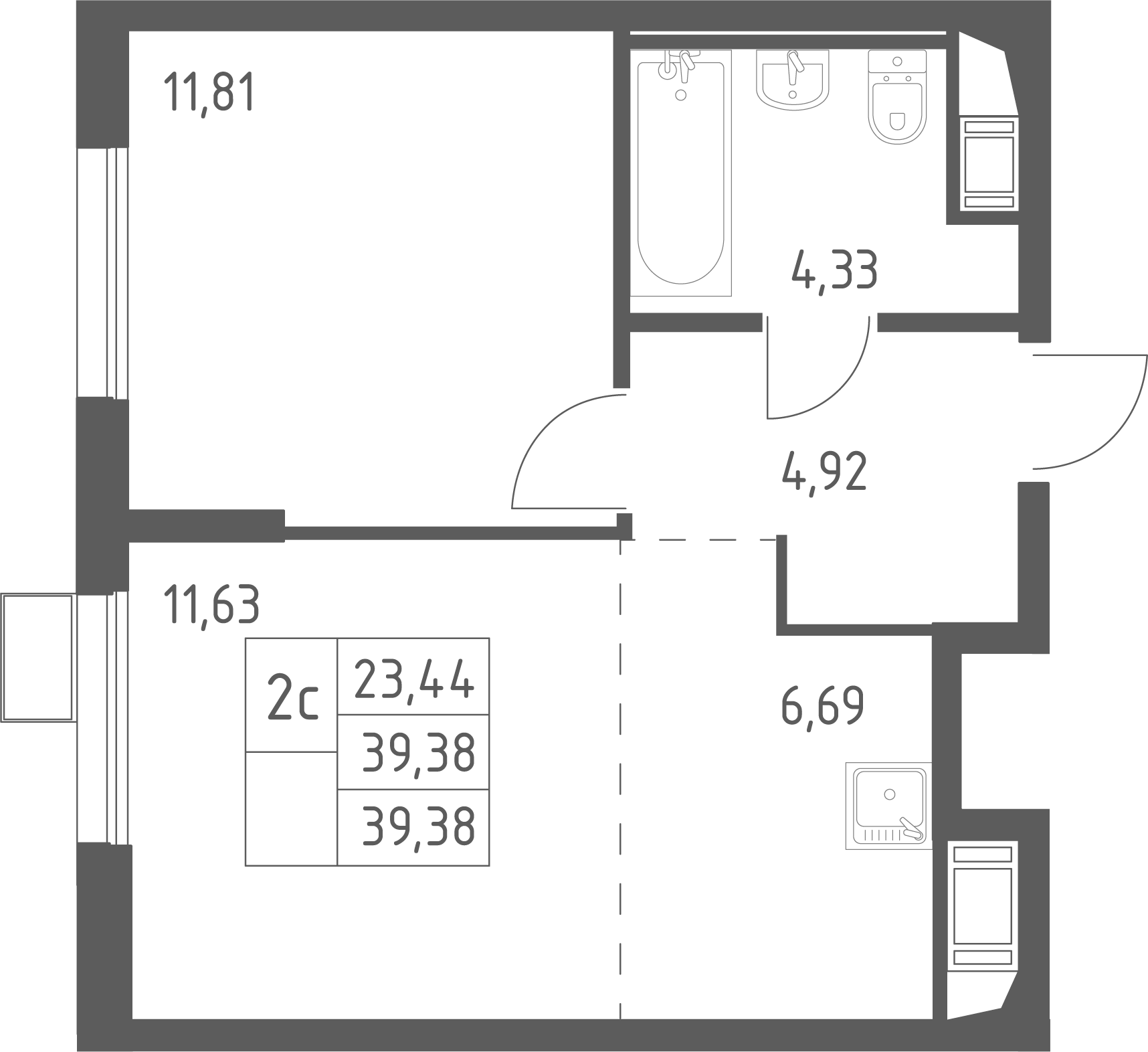 2-комнатная квартира № 147, 39.38 м2 с отделкой 11 эт.