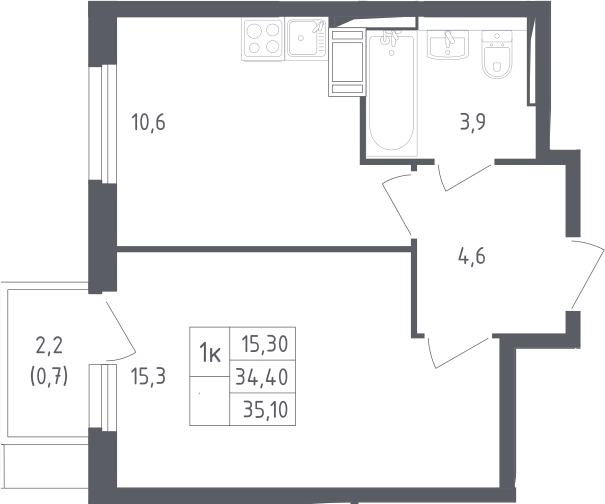 1-комнатная квартира № 1682, 34.40 м2 с отделкой 11 эт.