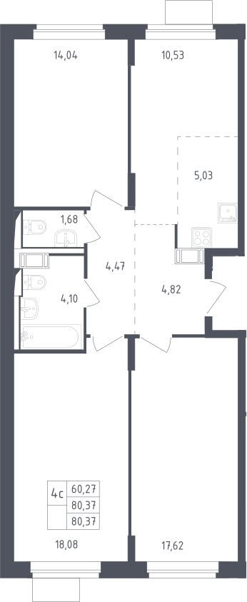 4-комнатная квартира № 845, 80.37 м2 с отделкой 8 эт.