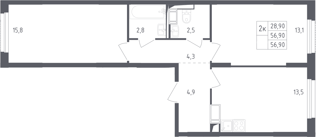 2-комнатная квартира № 54, 56.90 м2 с отделкой 6 эт.