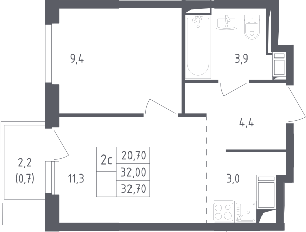2-комнатная квартира № 162, 32.00 м2 с отделкой 16 эт.