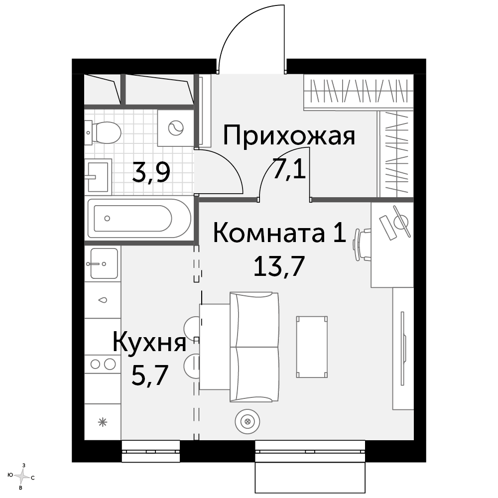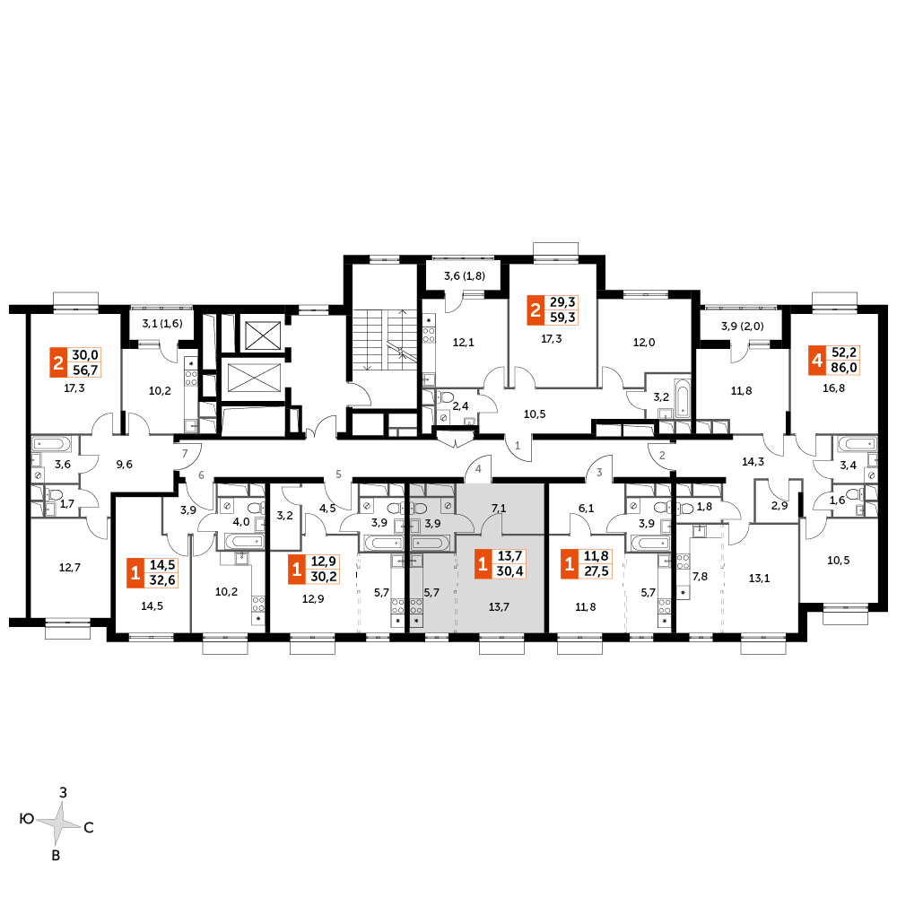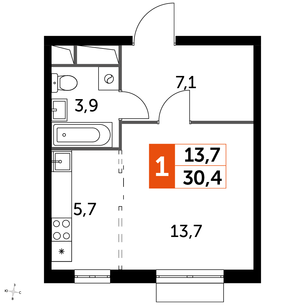 1-комнатная квартира № 1523, 30.40 м2 white-box 11 эт.