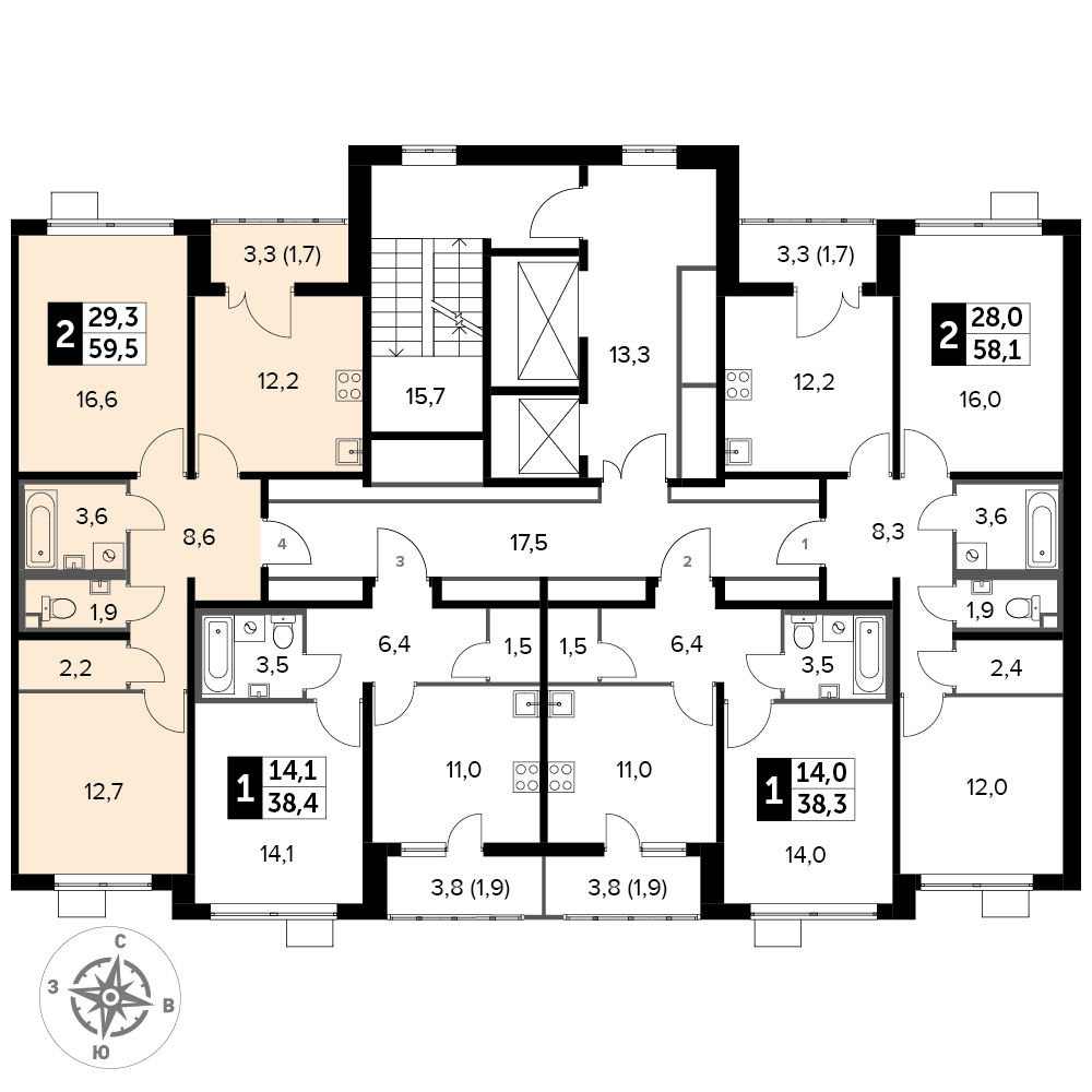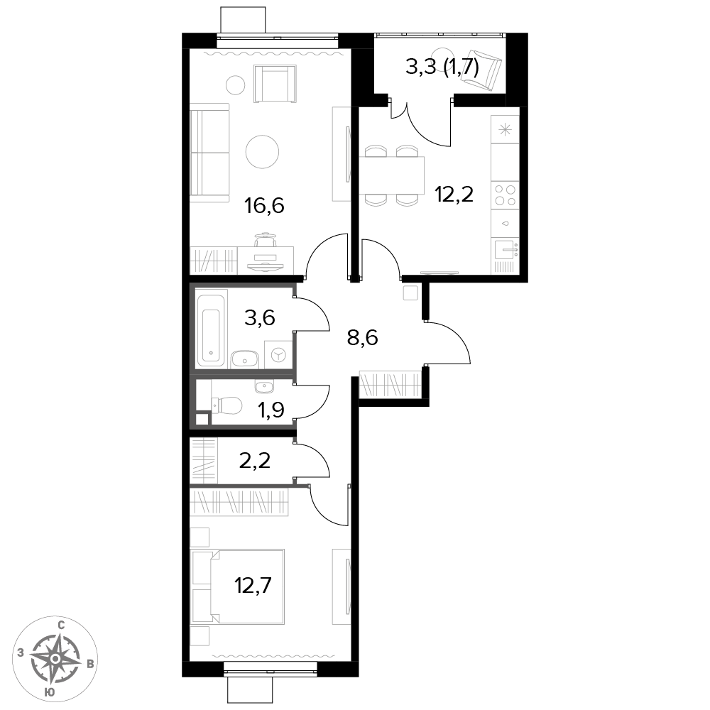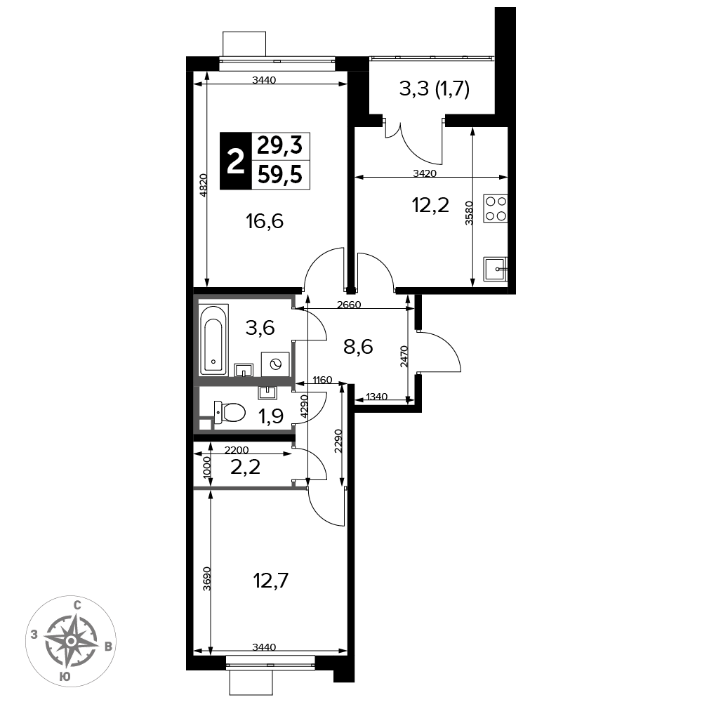 2-комнатная квартира № 617, 59.50 м2 white-box 23 эт.